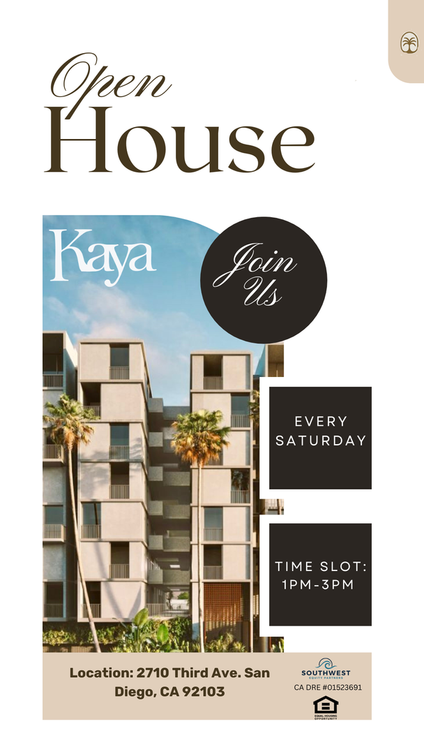 Open house tours are held Saturdays from 1–3 pm, or schedule a private showing with our Community Manager at 619.963.KAYA.