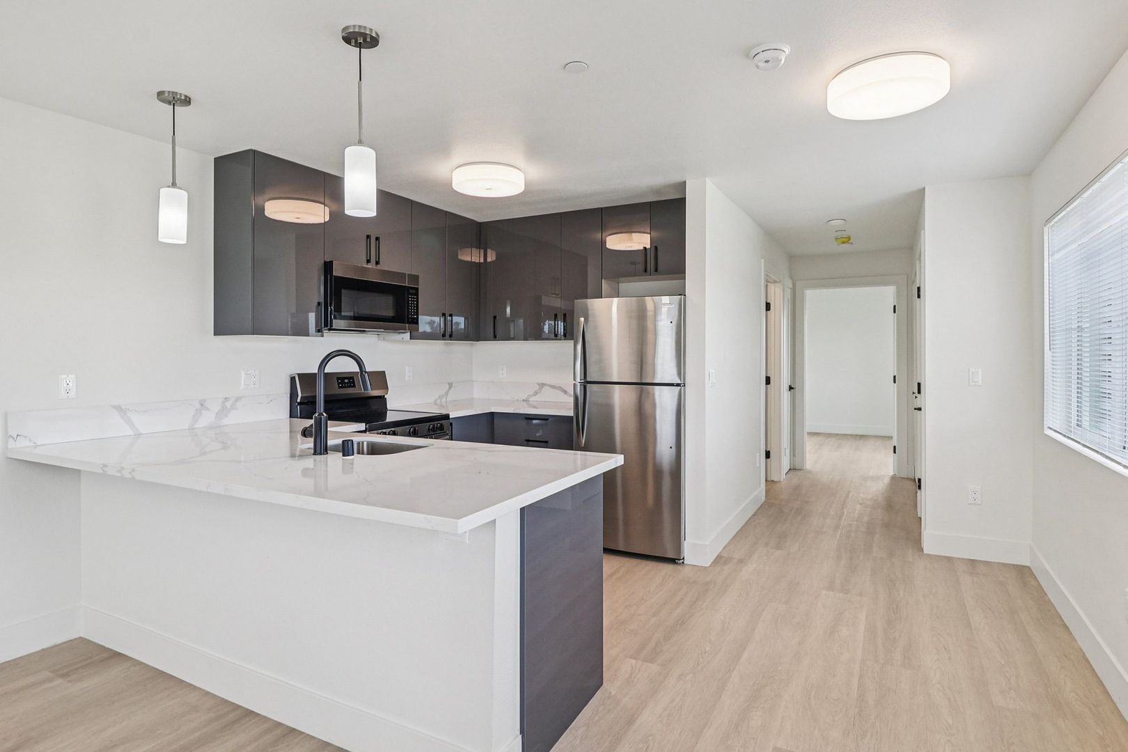 Enjoy designer kitchens with quartz countertops, stainless steel appliances, and in-unit laundry. The community also provides gated access, reserved parking, an on-site gym, and EV charging stations for your convenience.