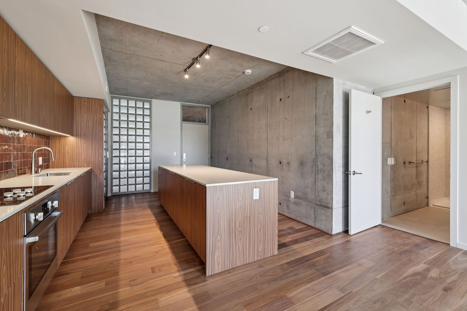 Designed by architect Jeff Svitak, Kaya features open-air walkways, illuminated glass-block corridors, and a lobby wrapped in Indonesian teak with curated art and custom furniture. Smart conveniences include community-wide WiFi, Latch keyless access, and water stations on every floor.