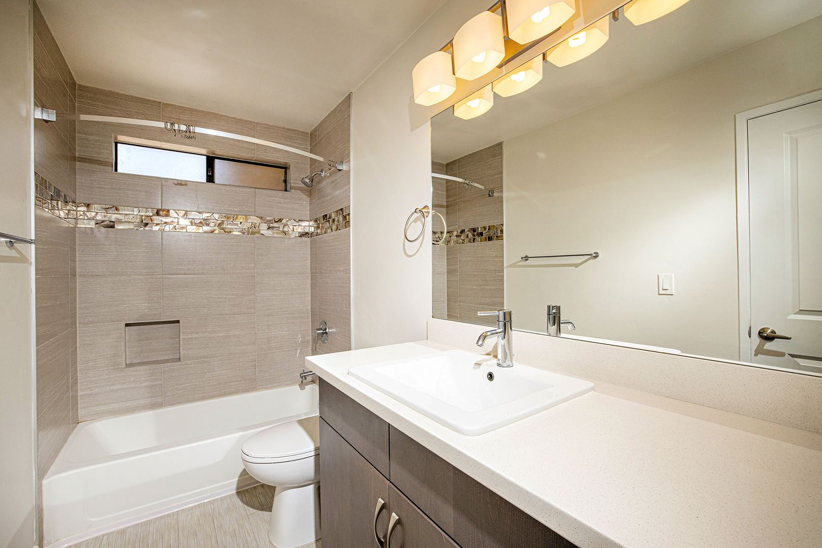 Step into upscale living with custom cabinetry, sleek white quartz countertops in the kitchen and bathroom, elegant mosaic tile backsplashes, and stainless-steel appliances. The warm vinyl wood plank flooring adds a touch of modern sophistication to the space.